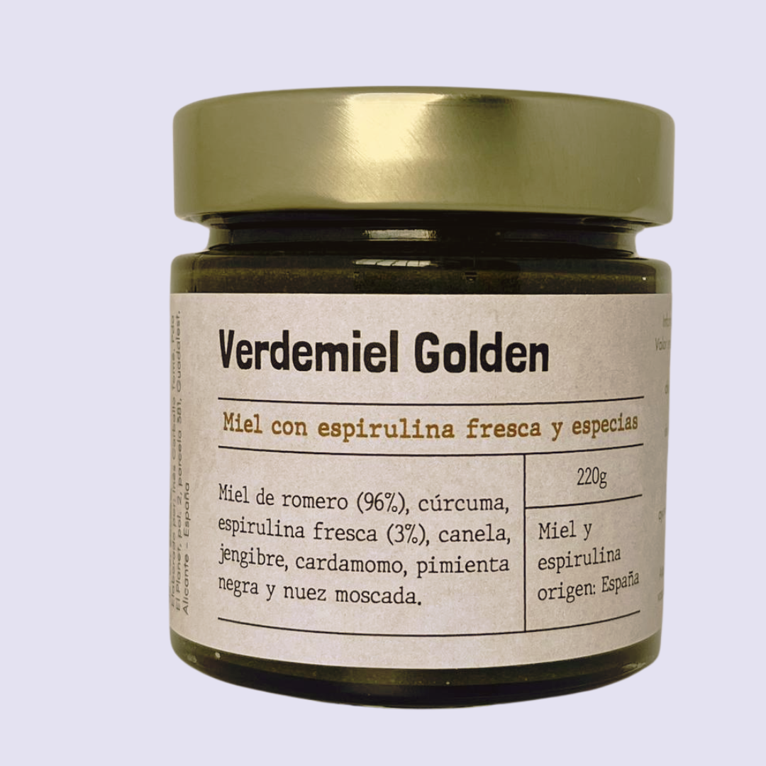 La nueva Verdemiel Golden. La miel cruda de romero de la Sierra de Aitana se une a la espirulina fresca y a una mezcla de especias ayurvédicas (cúrcuma, canela, jengibre, cardamomo…) para crear un elixir verde dorado.